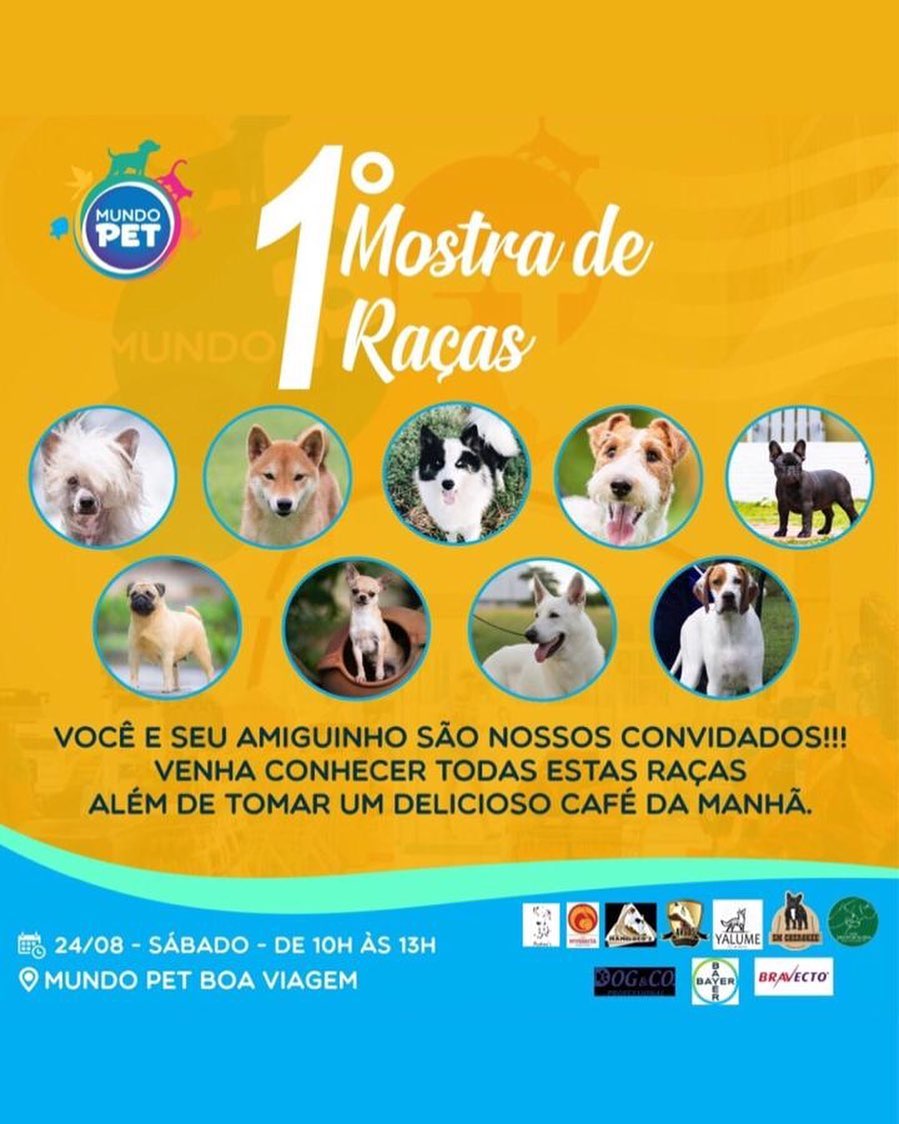 Neste sábado, 24/08, das 10h às 13h, juntamente com alguns amigos, criadores cinófilos, estaremos participando da 1ª Mostra de Raças da loja Mundo Pet Recife, de Boa Viagem, que fica no começo da Avenida Domingos Ferreira, no Pina.